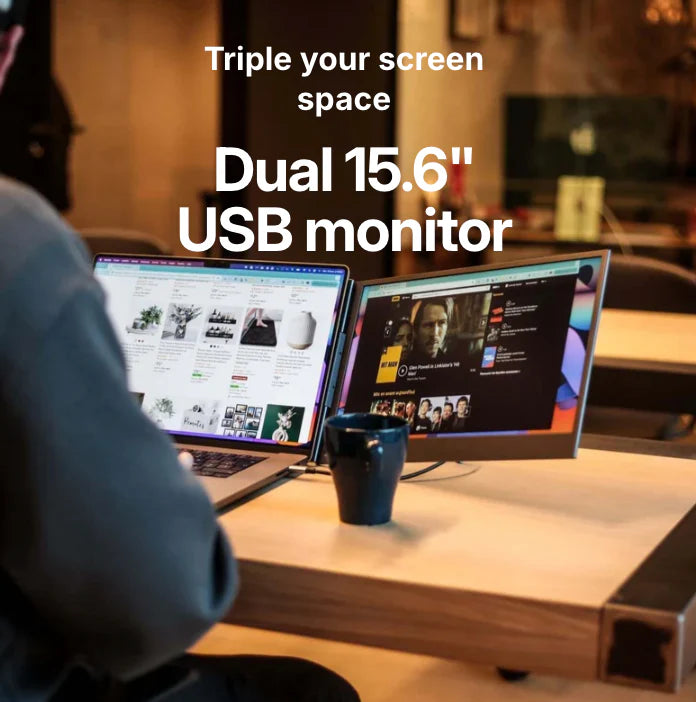 The Dual Boost 15.6 Pro features two 15.6” Full HD anti-glare screens, a sleek aluminum build, and single USB-C connectivity. Powerful, portable, and ready to go.